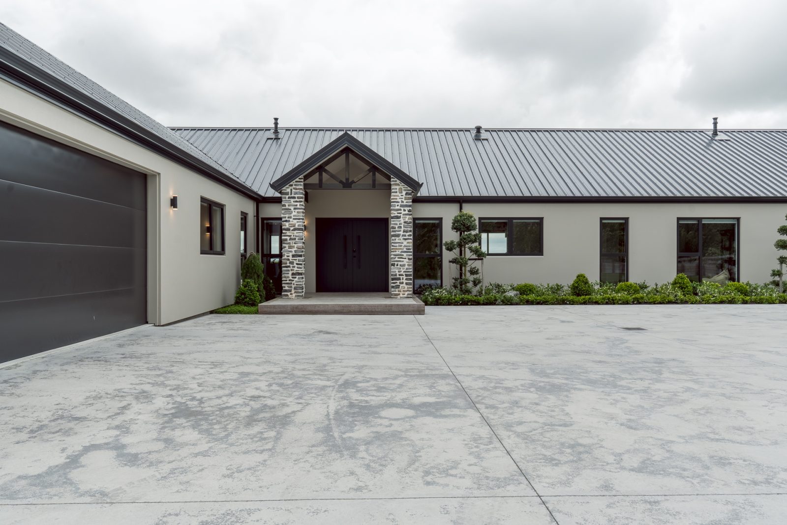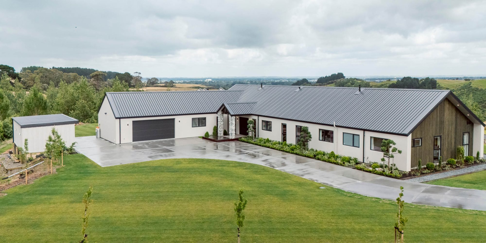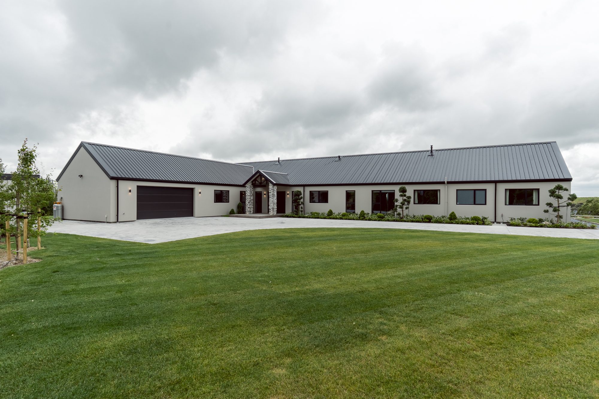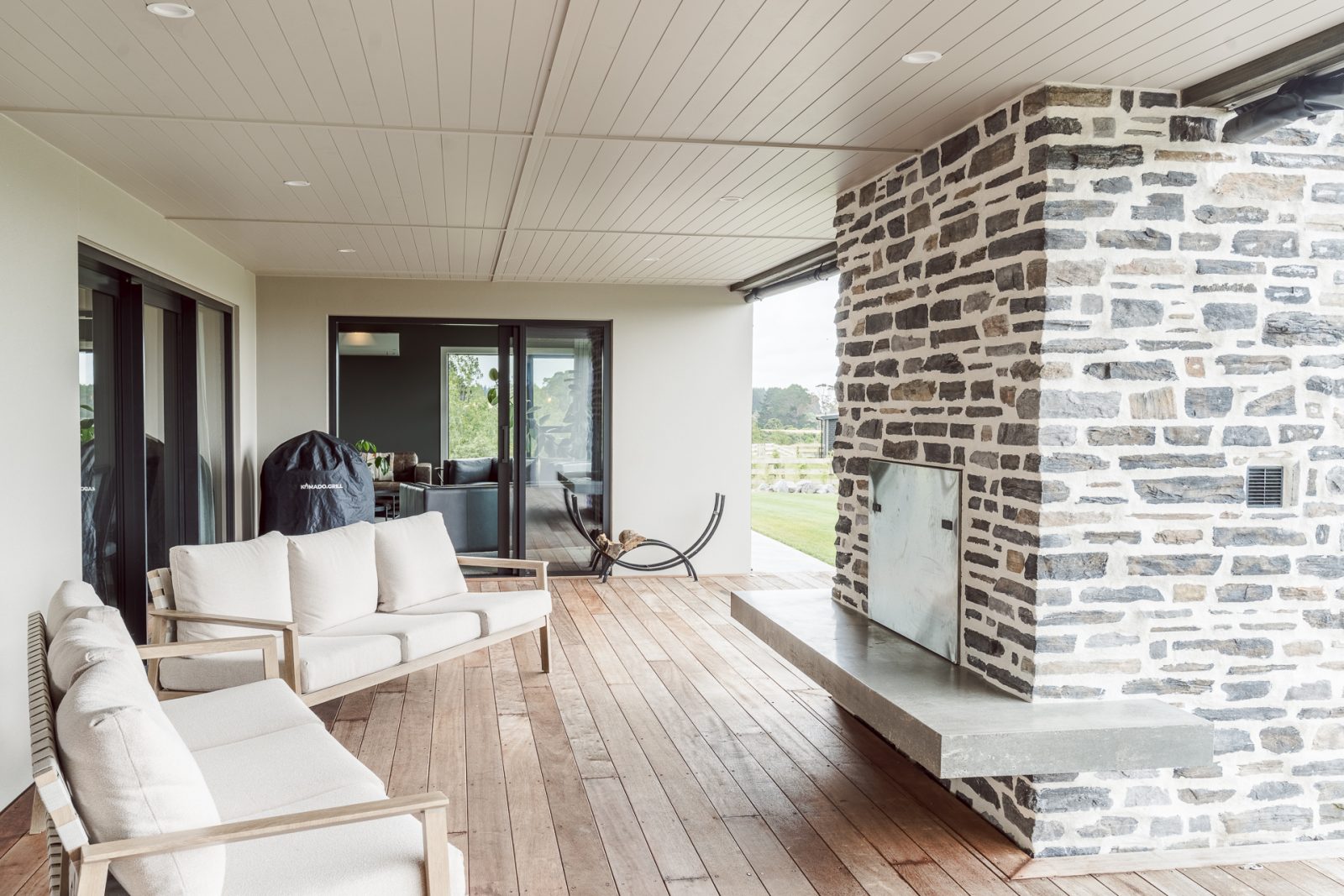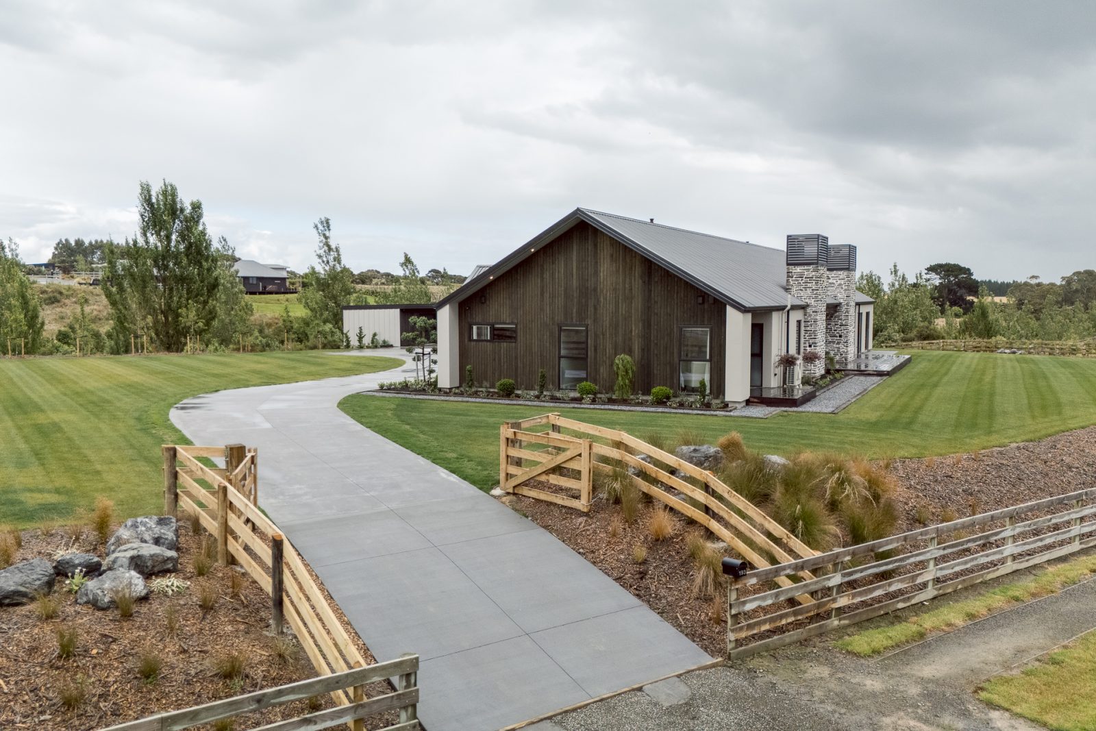 On the outside, a mix of Rockcote Graphex plaster, brushed shiplap weatherboards, and Eldorado stone gives the home a clean, timeless look that suits the rural setting, while the Colorsteel Endura Rib roof adds crisp lines and durability.