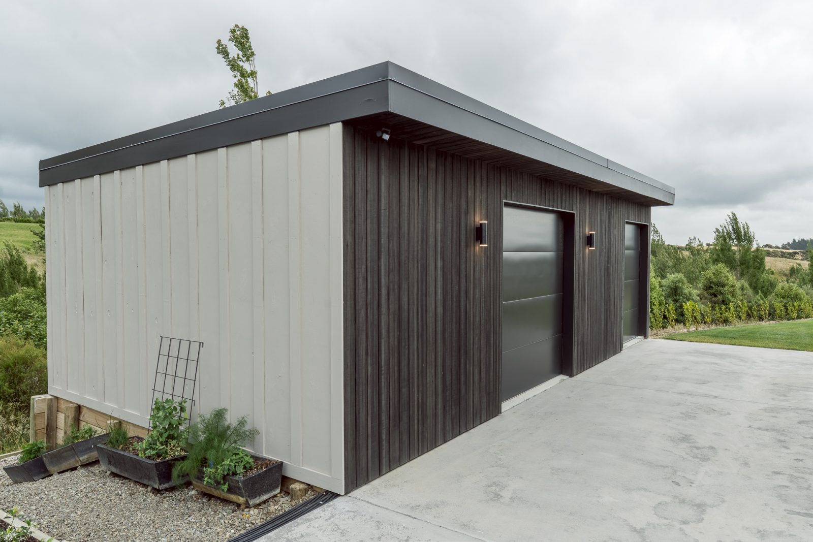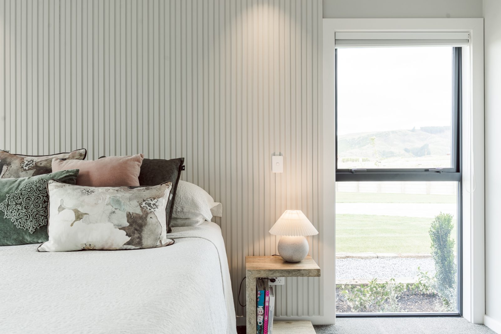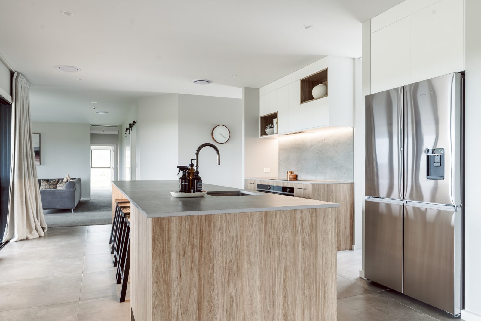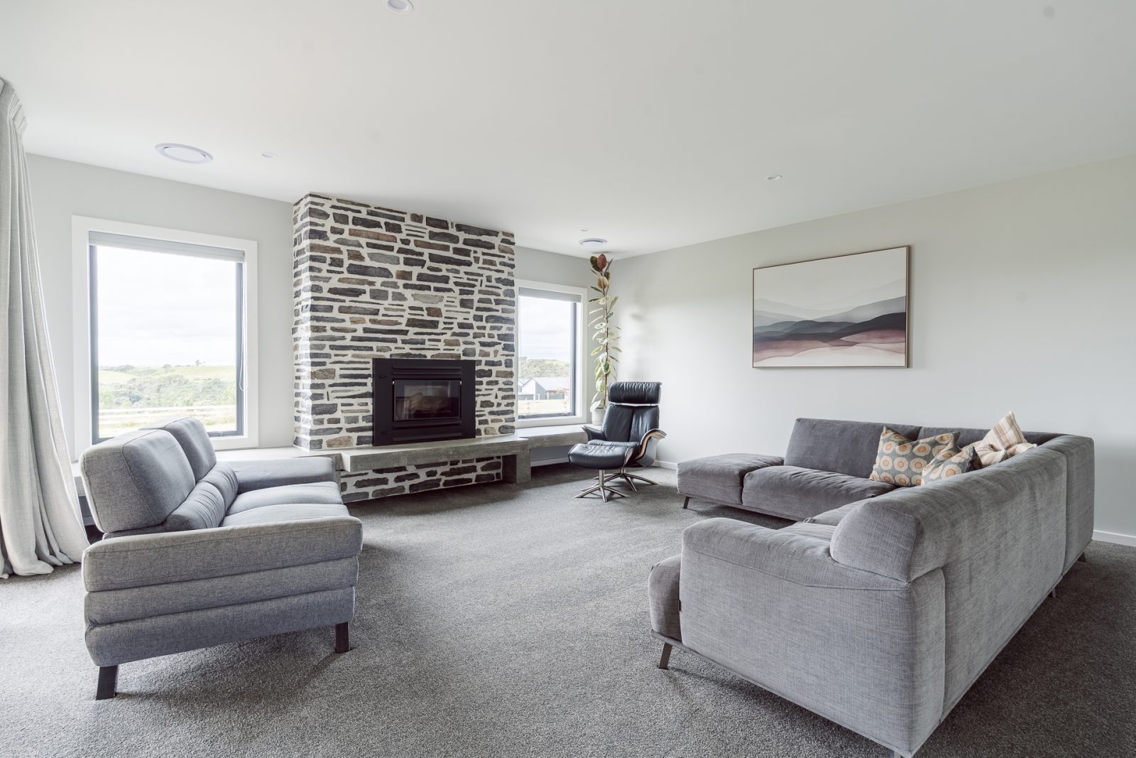 On the outside, a mix of Rockcote Graphex plaster, brushed shiplap weatherboards, and Eldorado stone gives the home a clean, timeless look that suits the rural setting, while the Colorsteel Endura Rib roof adds crisp lines and durability.