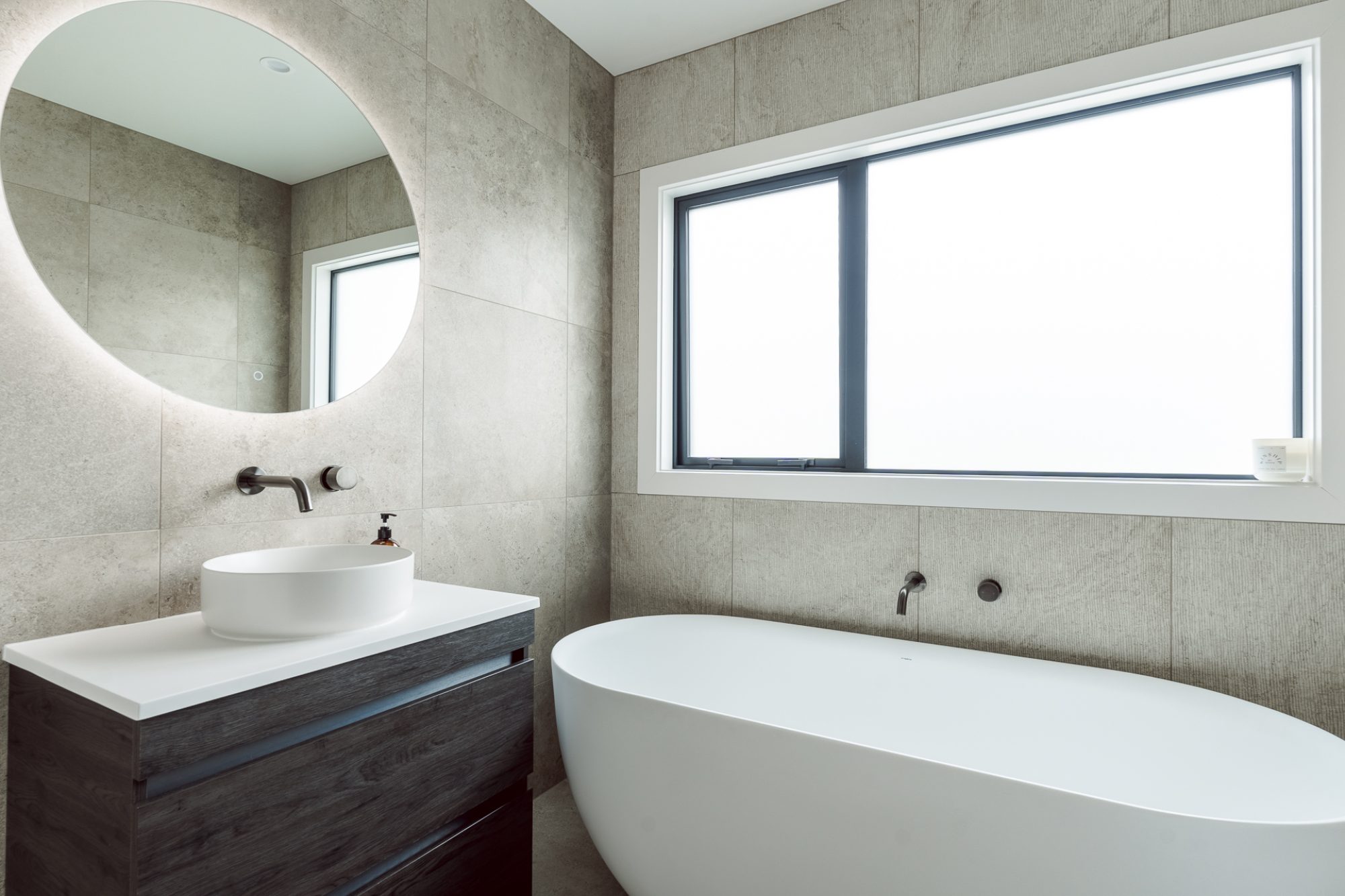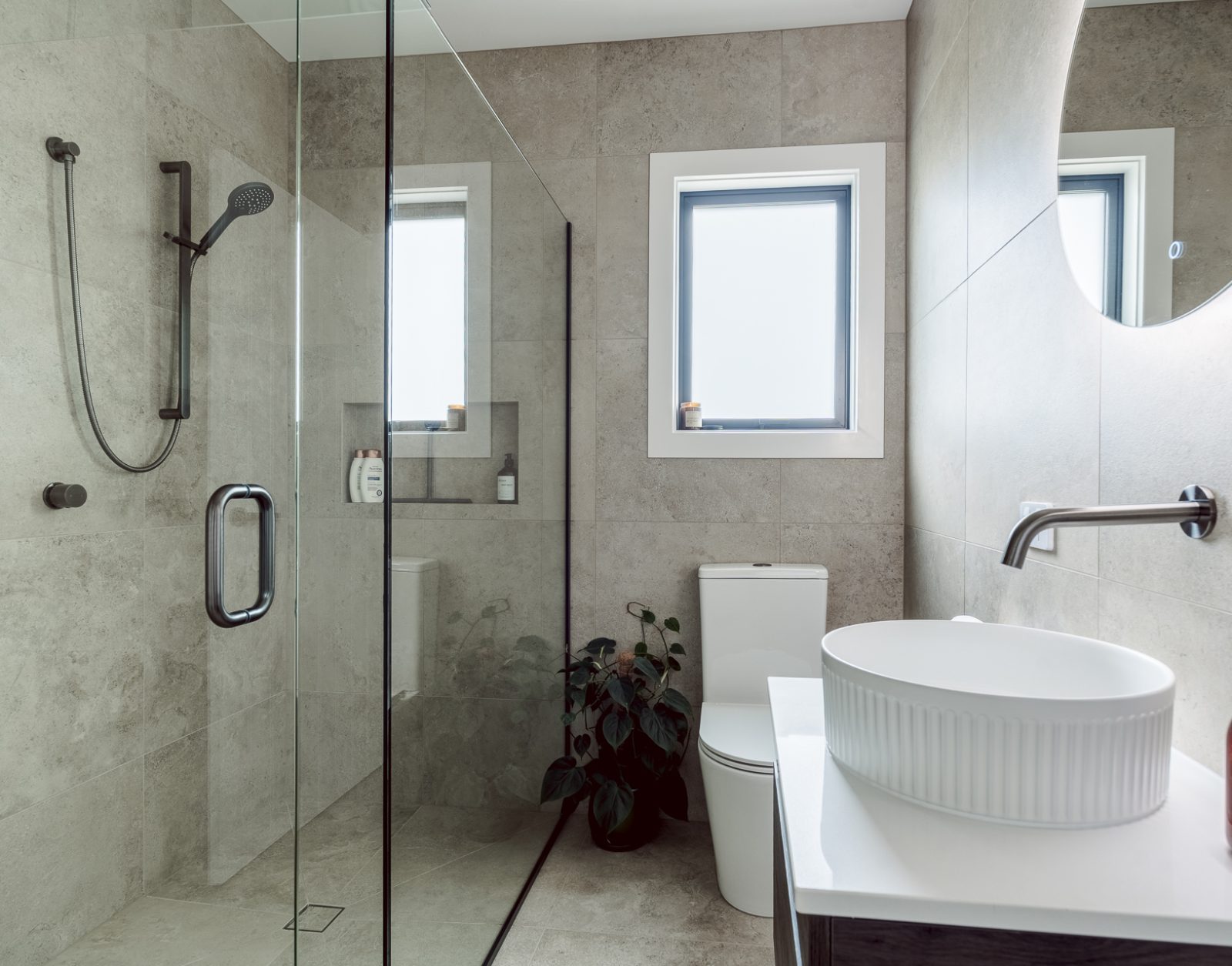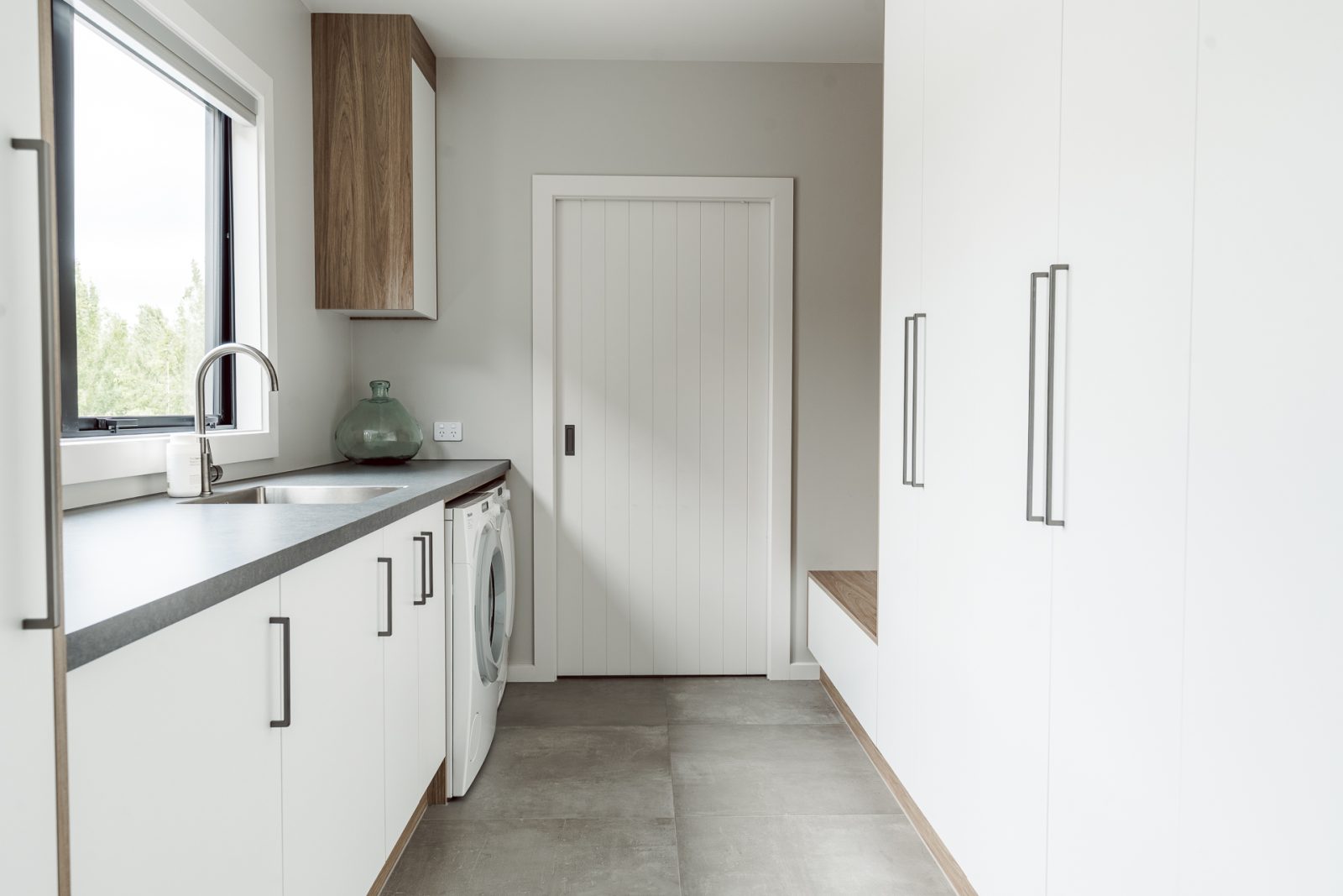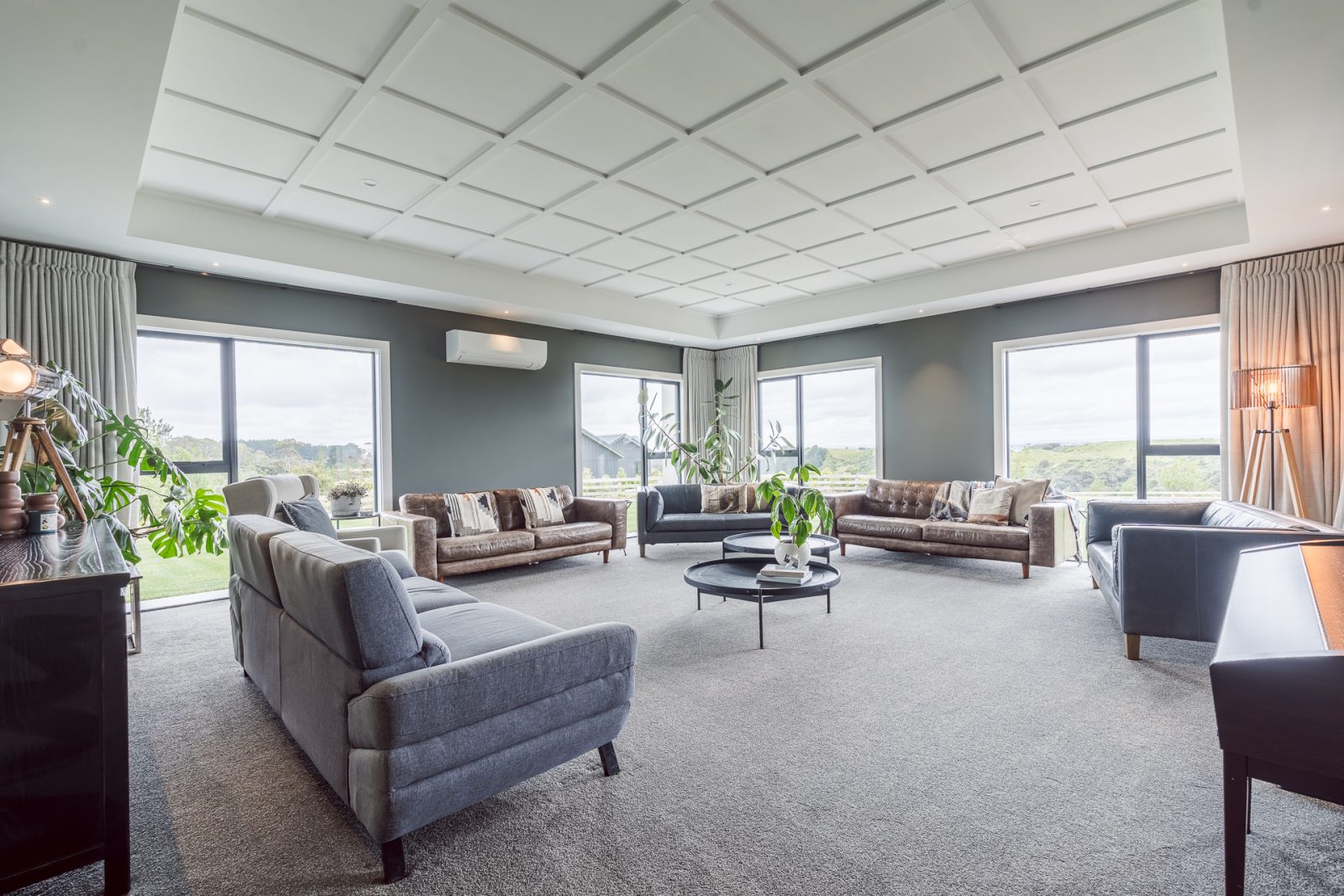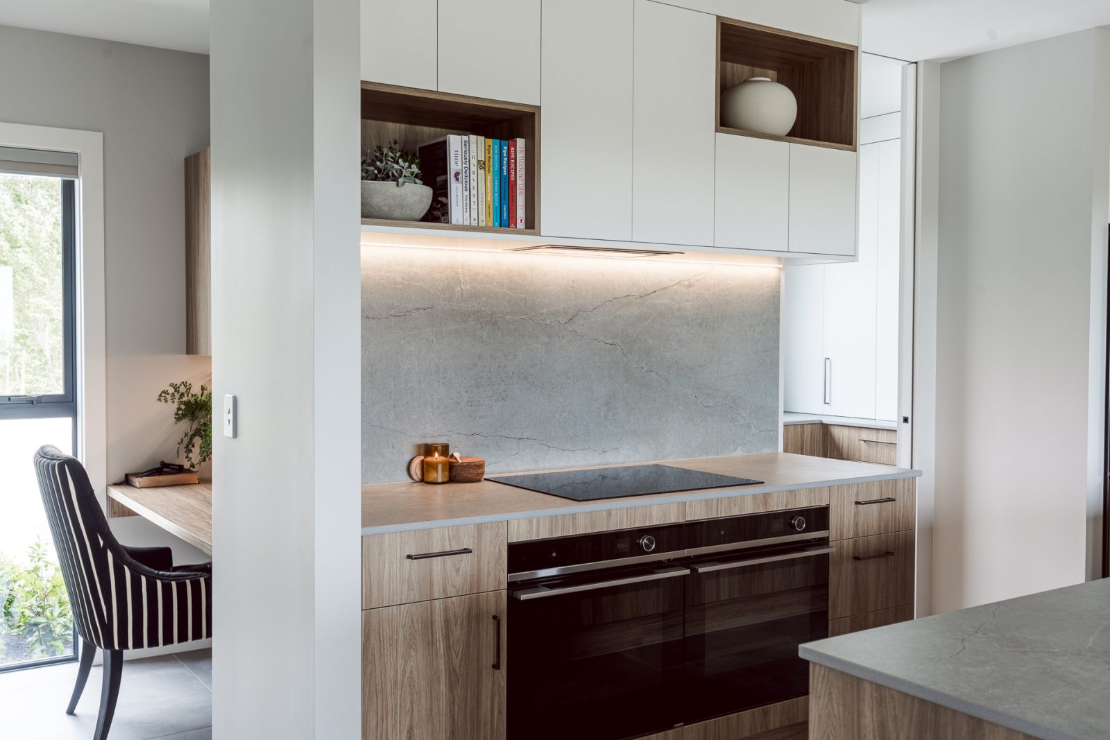 On the outside, a mix of Rockcote Graphex plaster, brushed shiplap weatherboards, and Eldorado stone gives the home a clean, timeless look that suits the rural setting, while the Colorsteel Endura Rib roof adds crisp lines and durability.